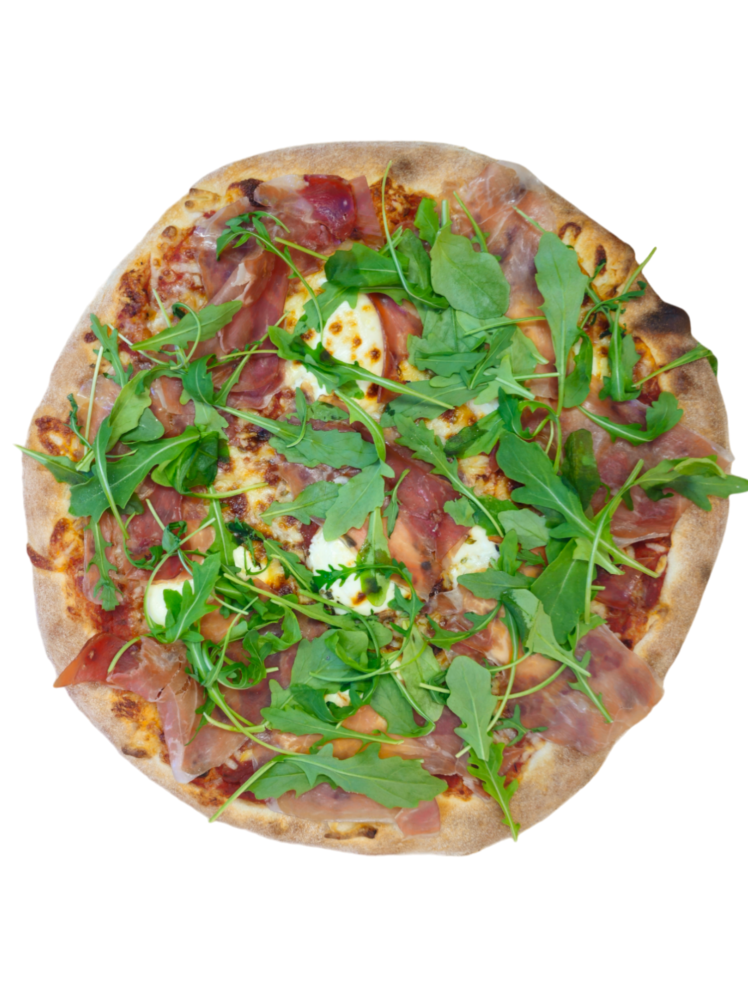 Base de tomate, mozzarella, jamón serrano, queso parmesano, tomate cherry, rúcula, aceite de oliva.